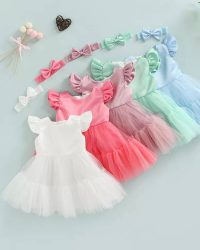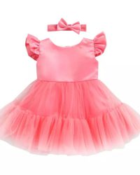 שמלת סאטן טול ורוד ורד נפוחה וסרט פפיון תואם לראש